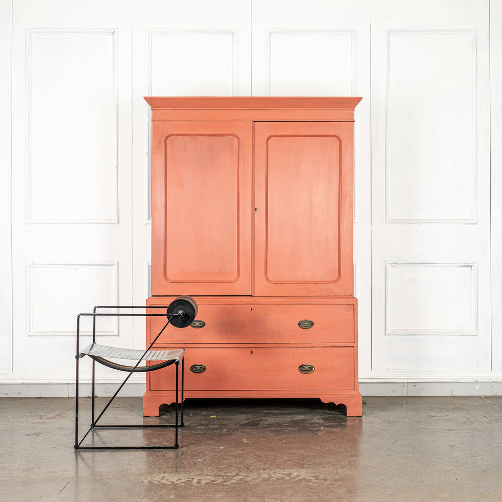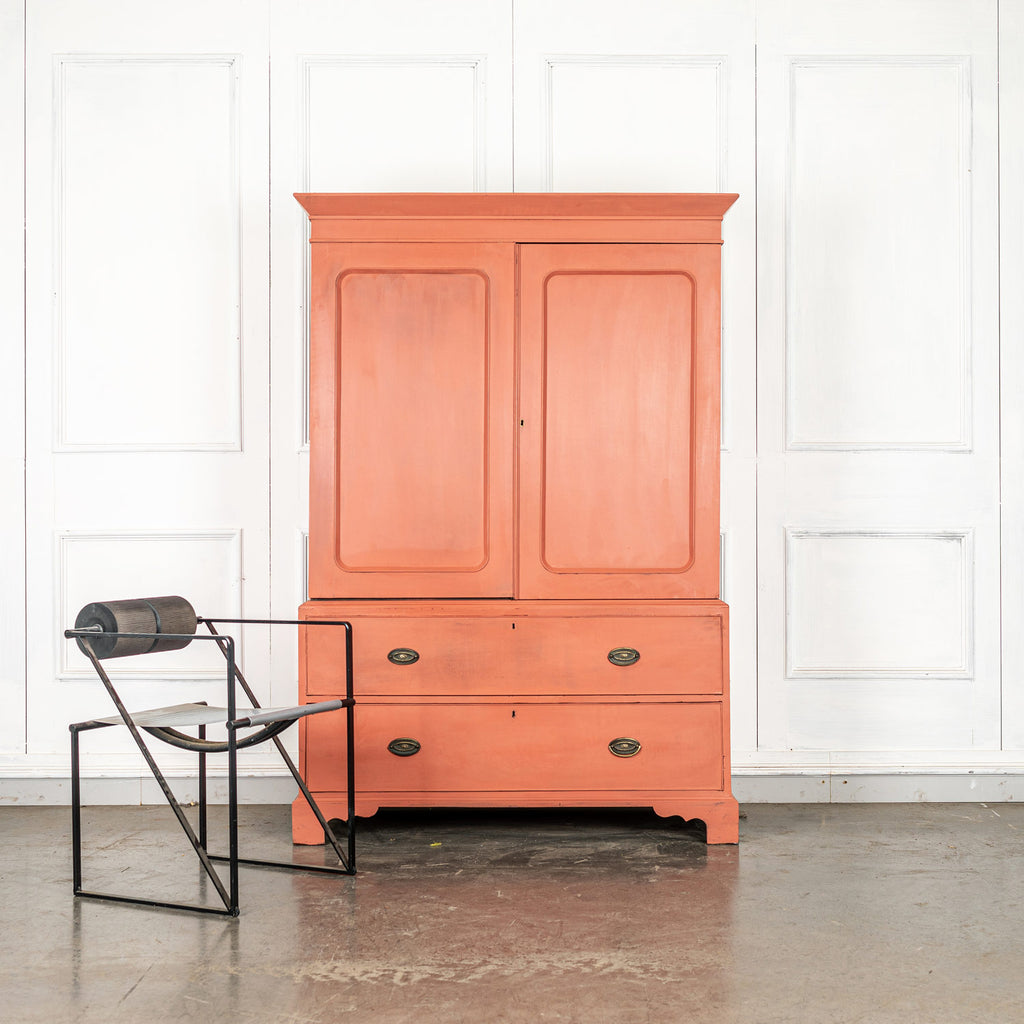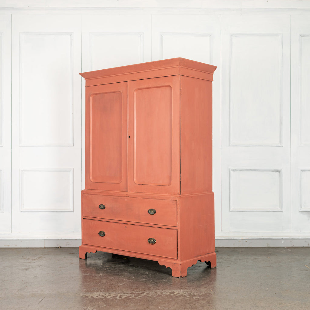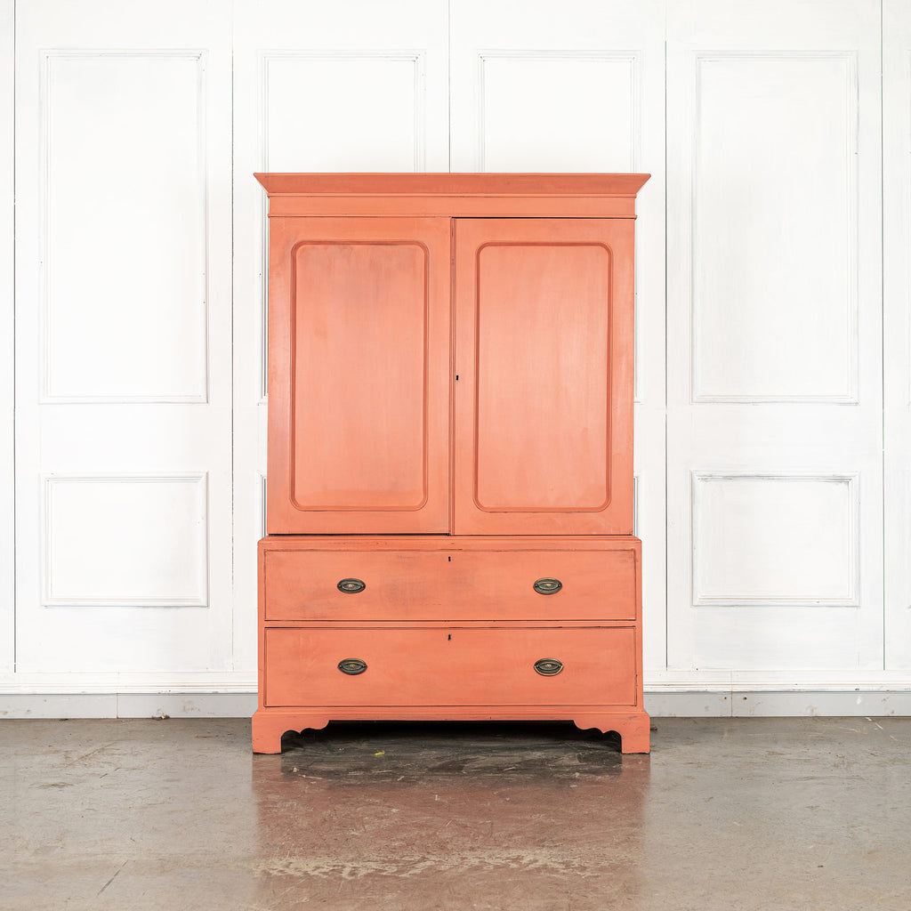 19th Century Mahogany linen press later painted with canted cornice above a plain frieze with two panelled doors enclosing hanging space over one faux drawer and a single long drawer on bracket feet. Latch present with new key.