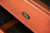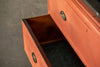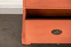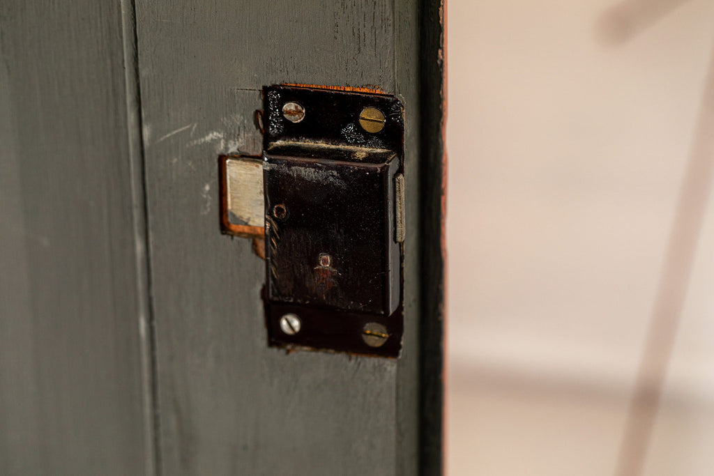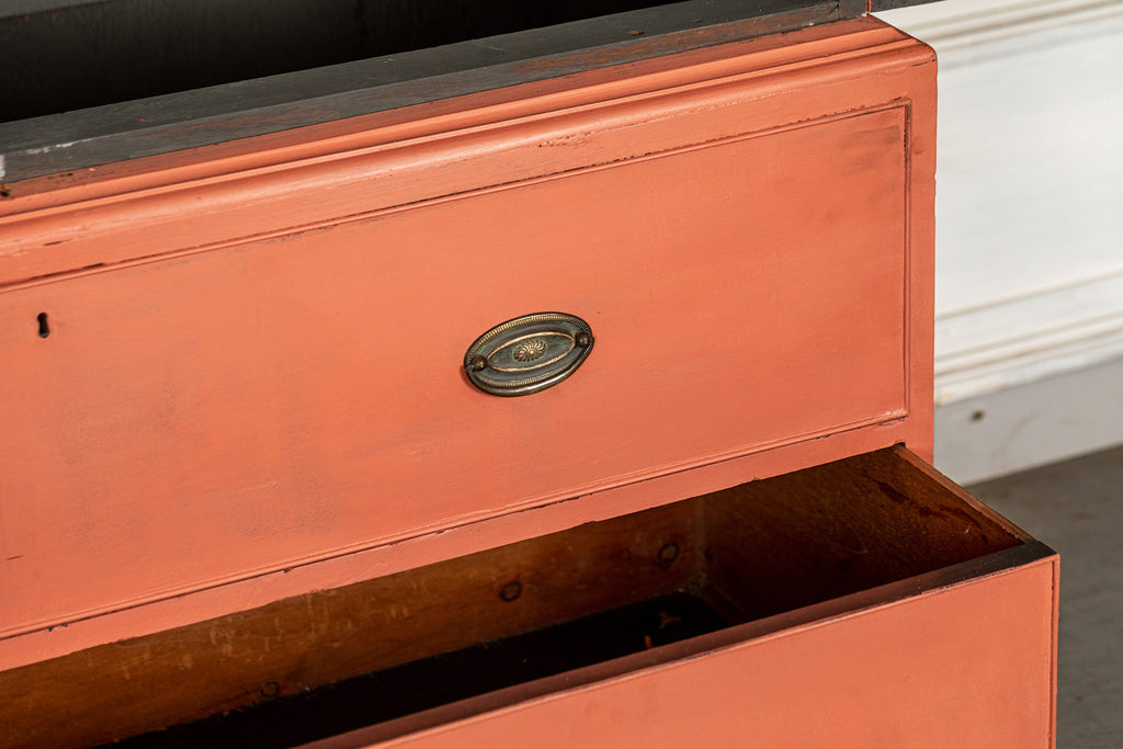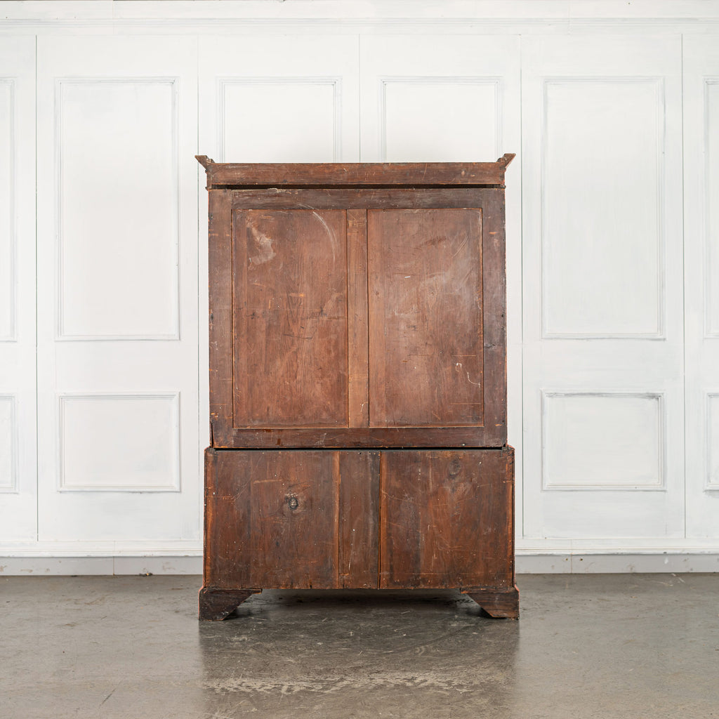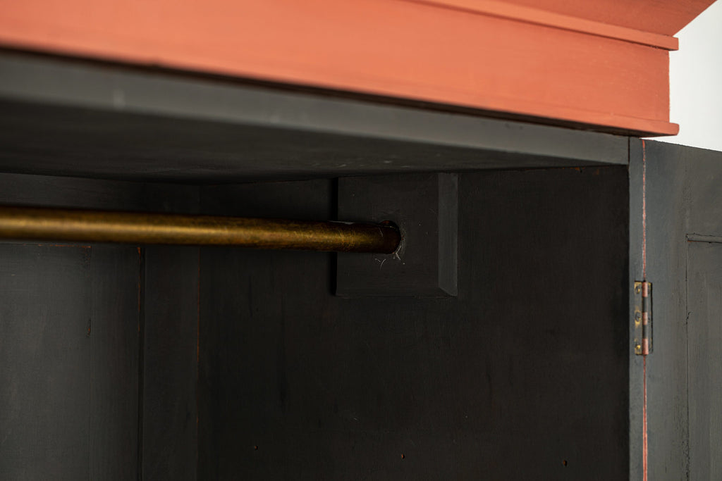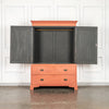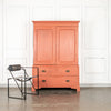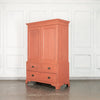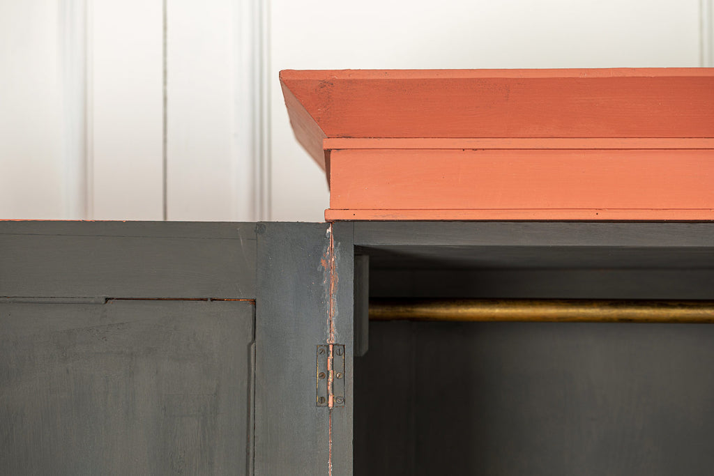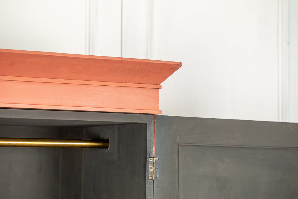 19th Century Mahogany linen press later painted with canted cornice above a plain frieze with two panelled doors enclosing hanging space over one faux drawer and a single long drawer on bracket feet. Latch present with new key.