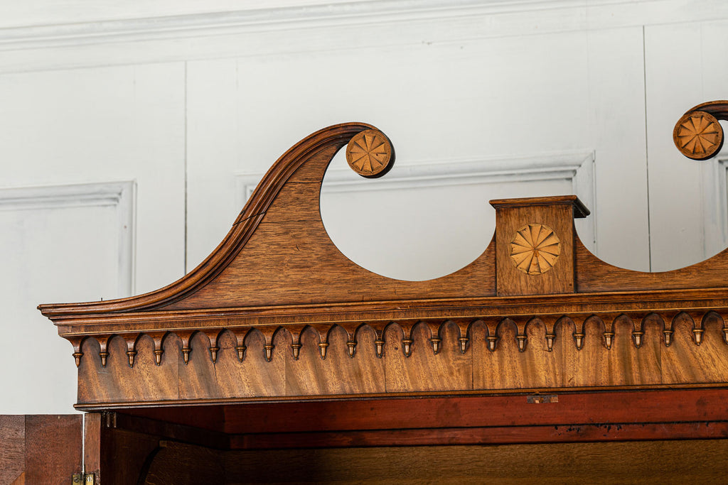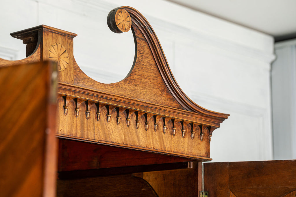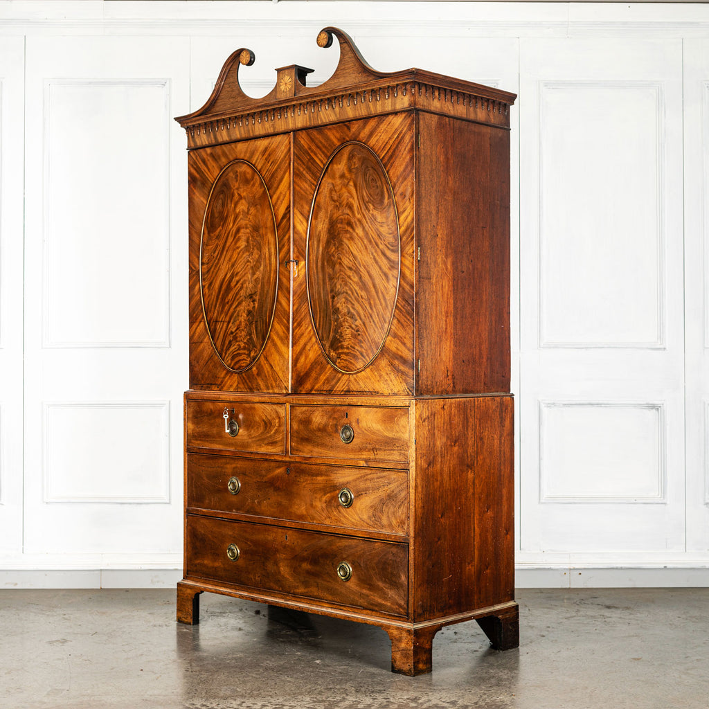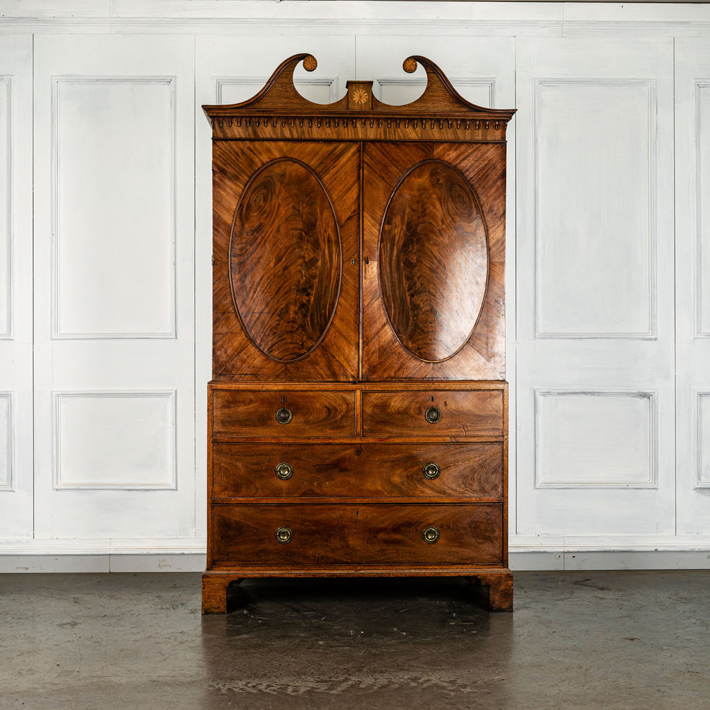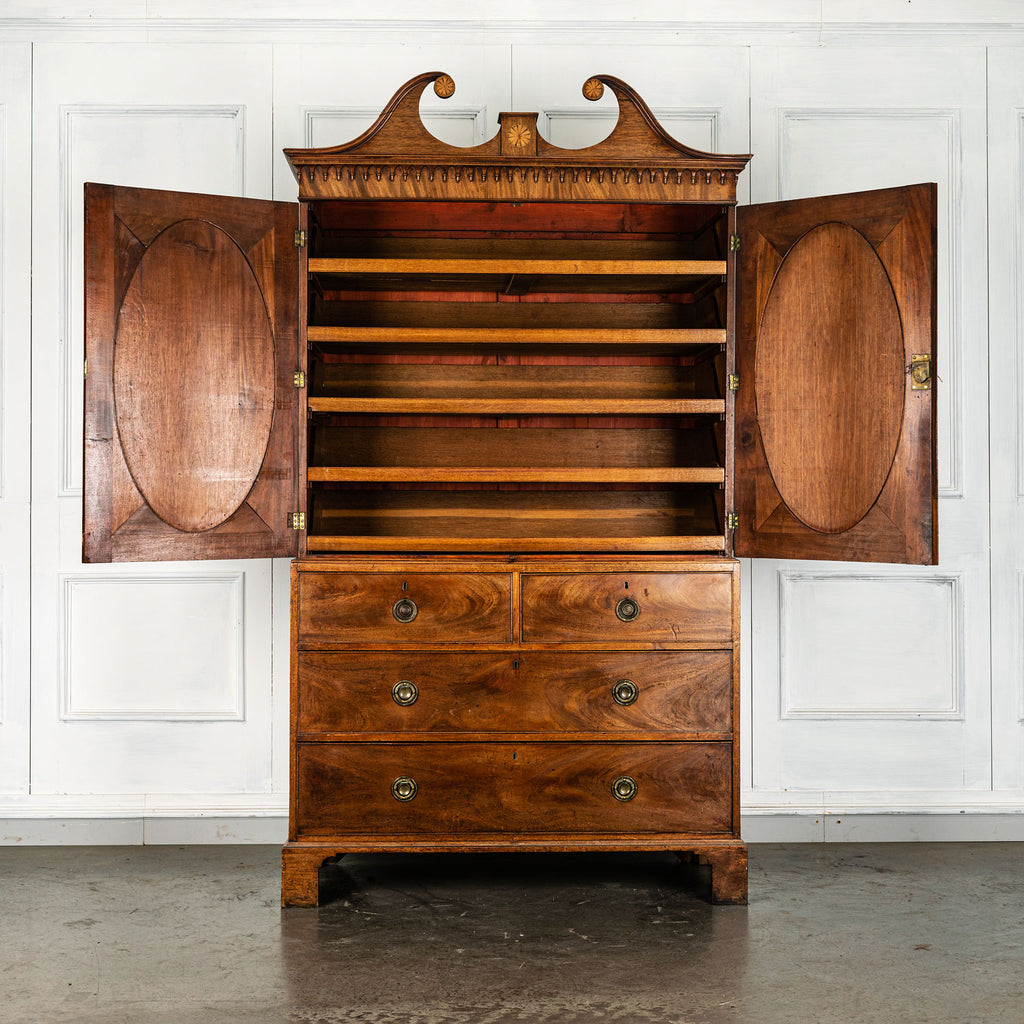 George 111 Mahogany Linen Press, late 18th Century, with scrolled pediment above an arcaded frieze and two cupboard doors below with oval panels enclosing six sliding trays. The base has two short over two long graduated and cockbeaded drawers with brass plate ring handles on bracket feet. All locks and latches present with key. A piece of exceptional quality.