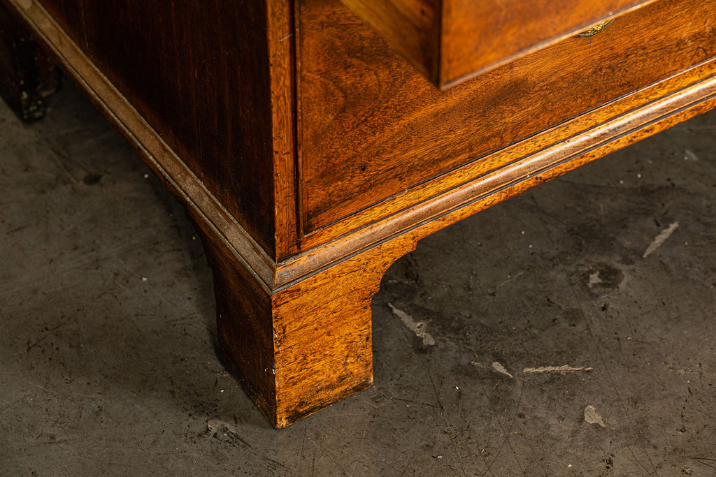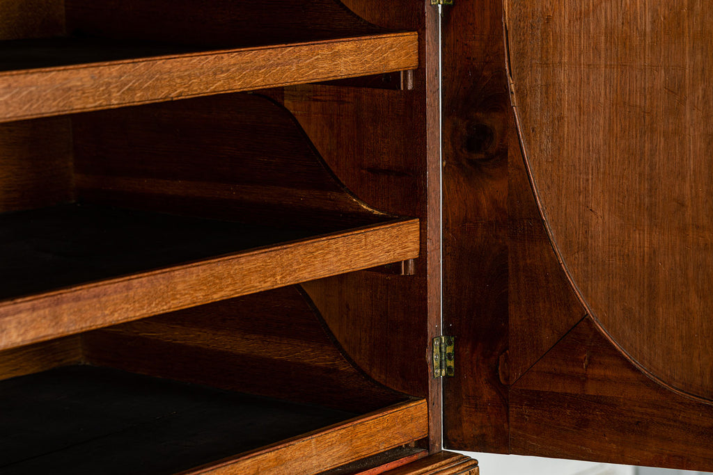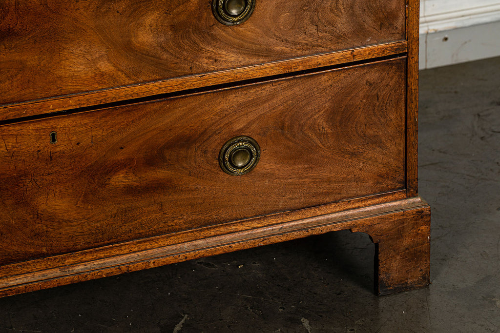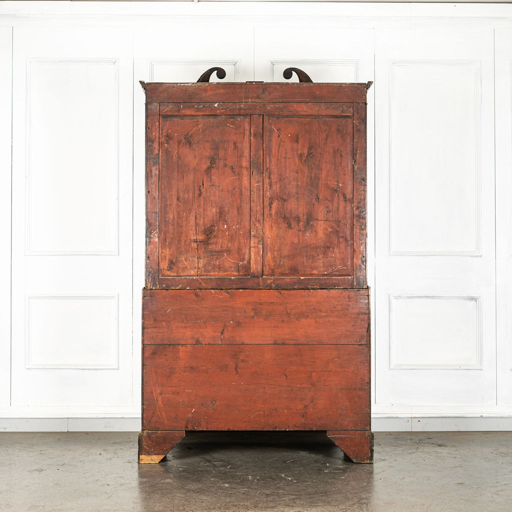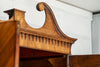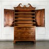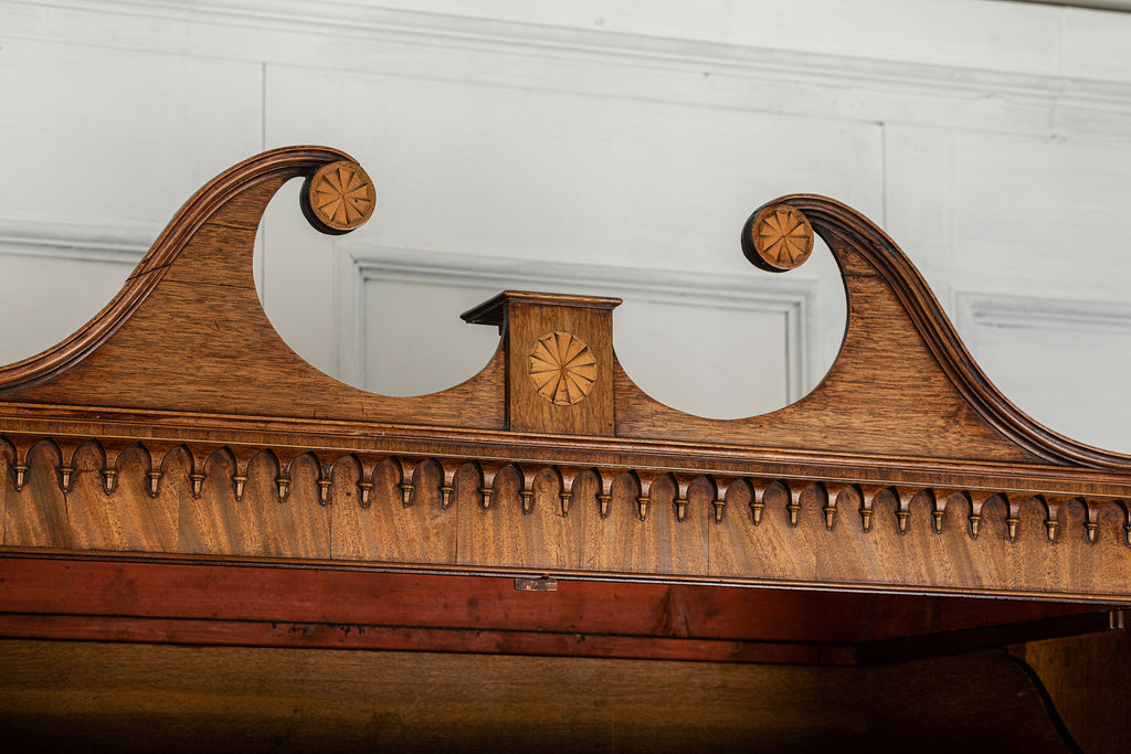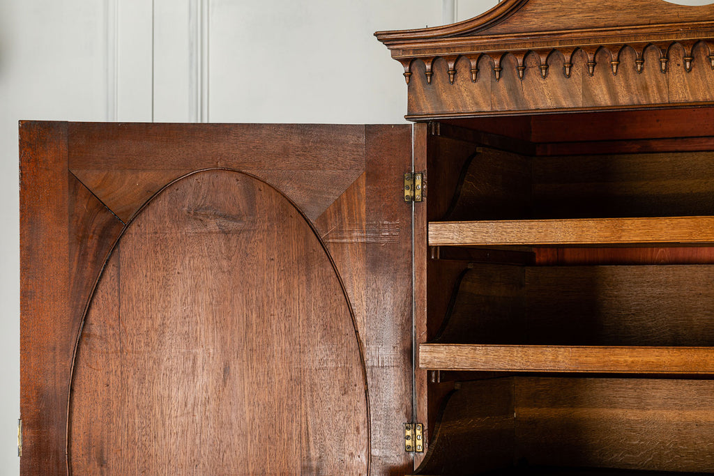 George 111 Mahogany Linen Press, late 18th Century, with scrolled pediment above an arcaded frieze and two cupboard doors below with oval panels enclosing six sliding trays. The base has two short over two long graduated and cockbeaded drawers with brass plate ring handles on bracket feet. All locks and latches present with key. A piece of exceptional quality.