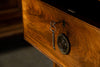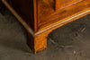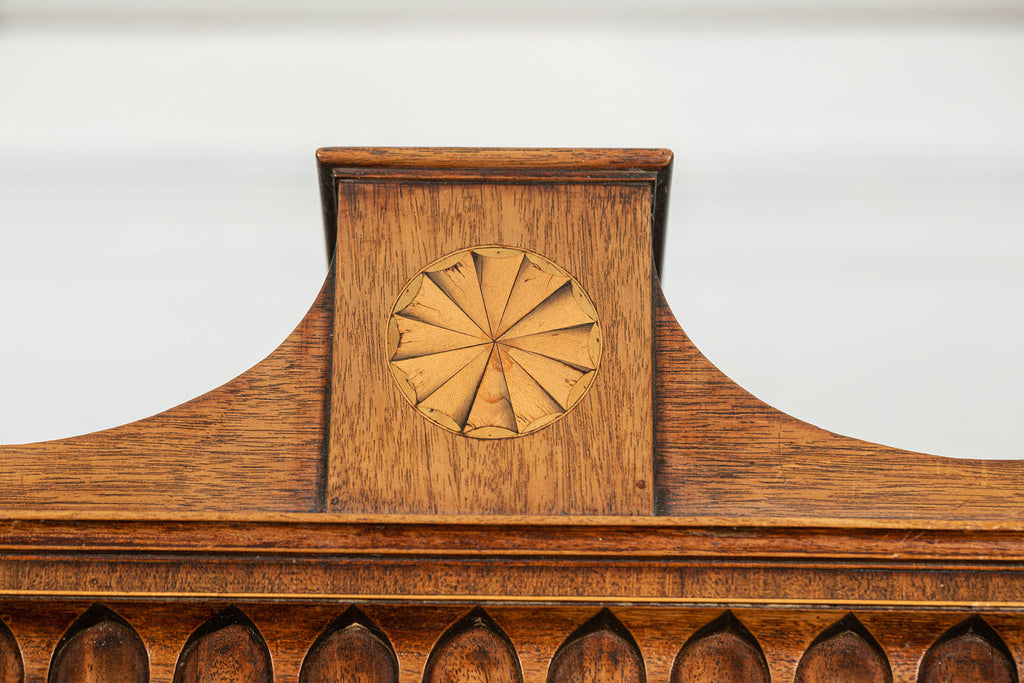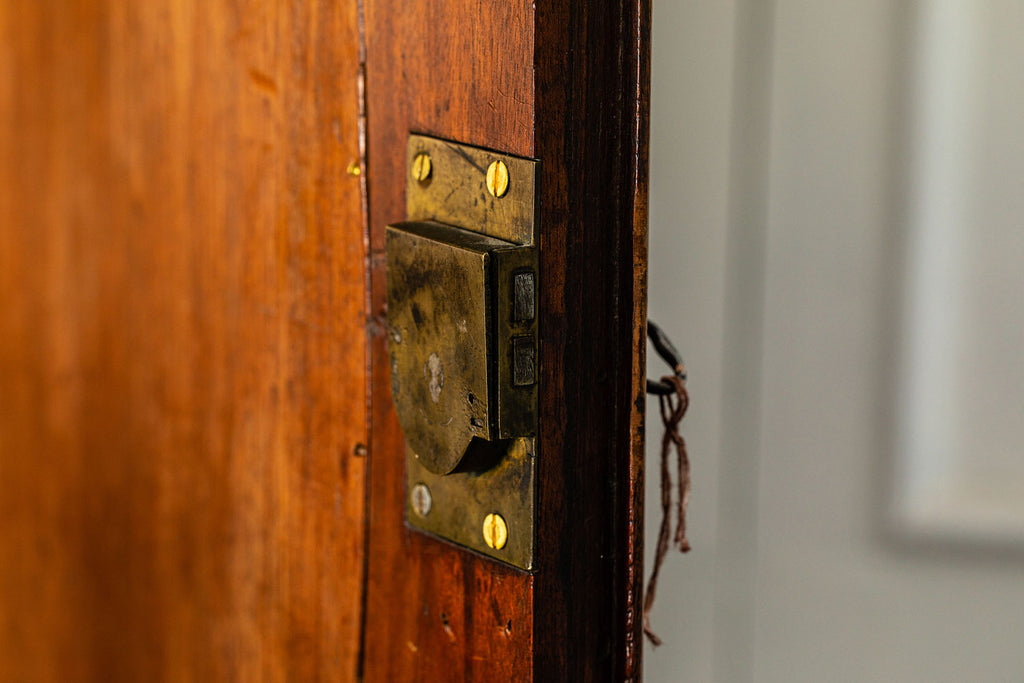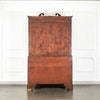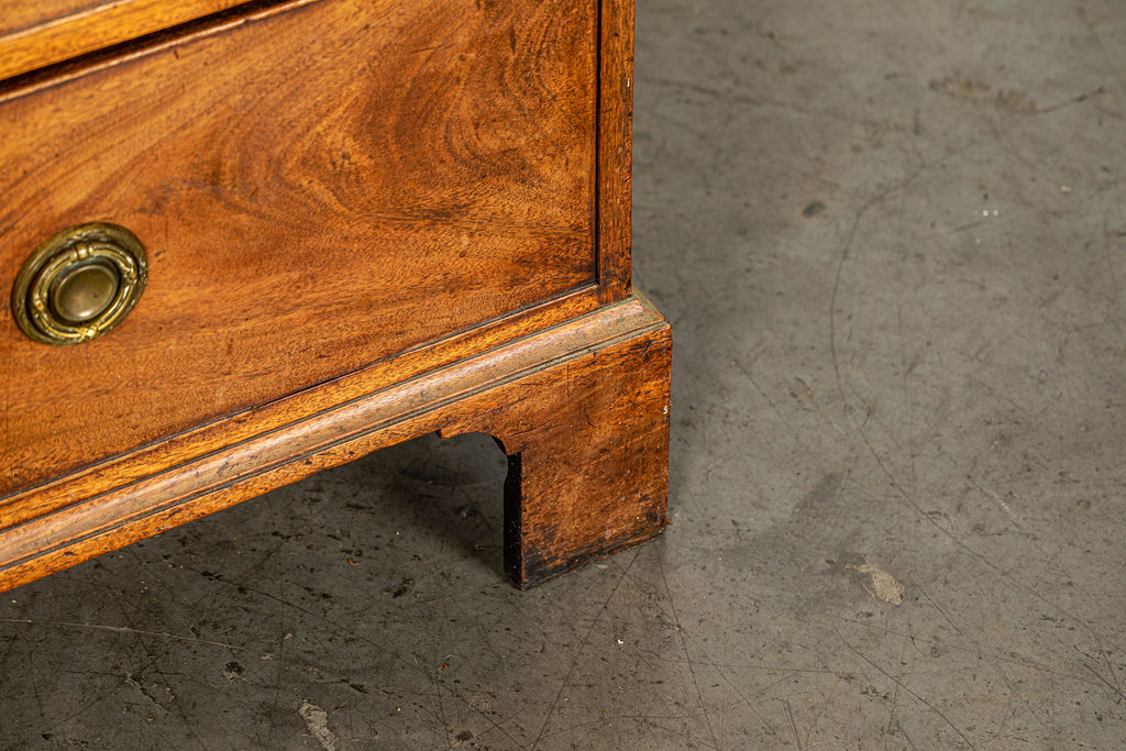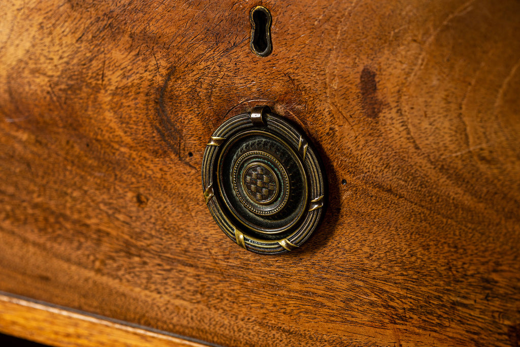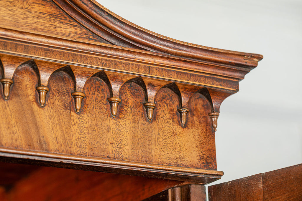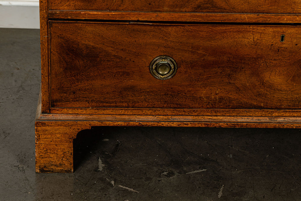 George 111 Mahogany Linen Press, late 18th Century, with scrolled pediment above an arcaded frieze and two cupboard doors below with oval panels enclosing six sliding trays. The base has two short over two long graduated and cockbeaded drawers with brass plate ring handles on bracket feet. All locks and latches present with key. A piece of exceptional quality.