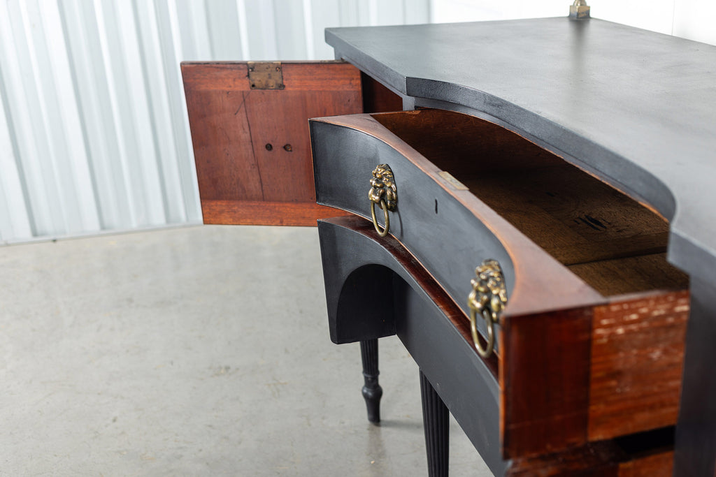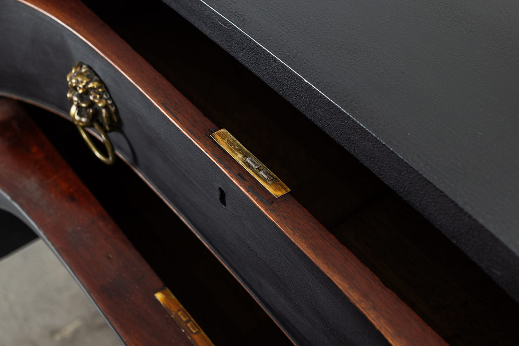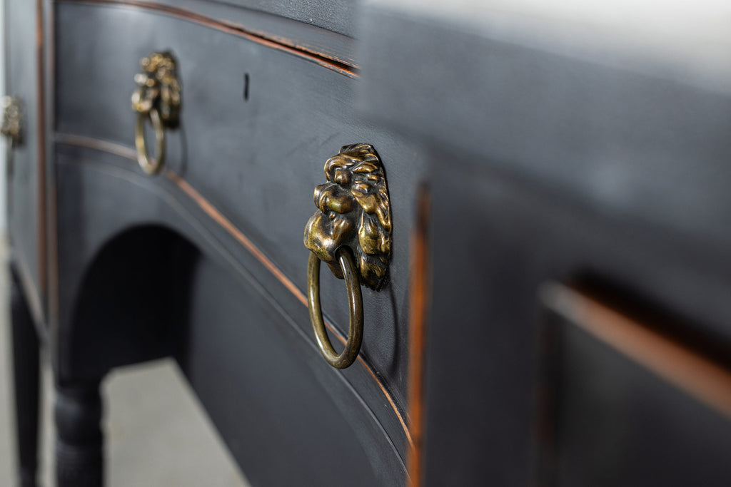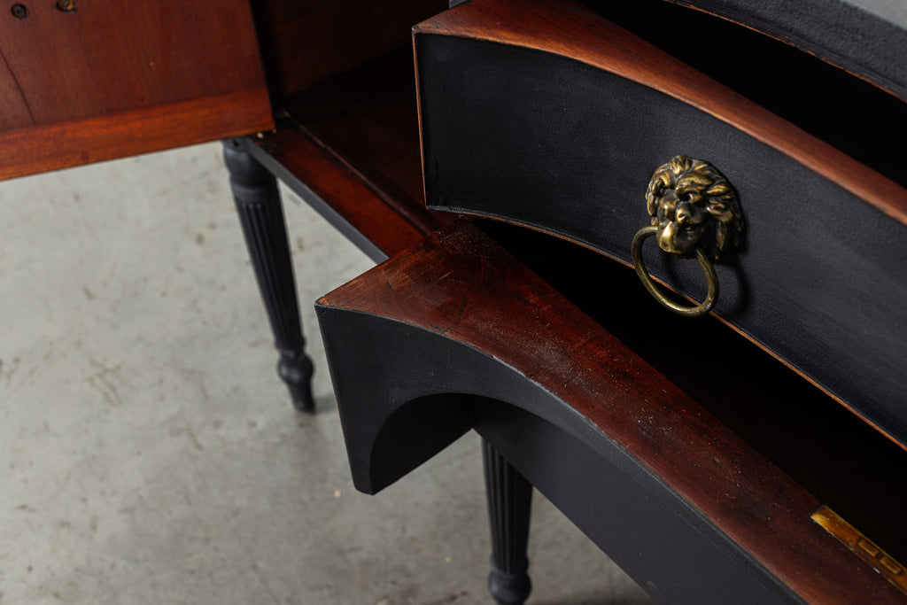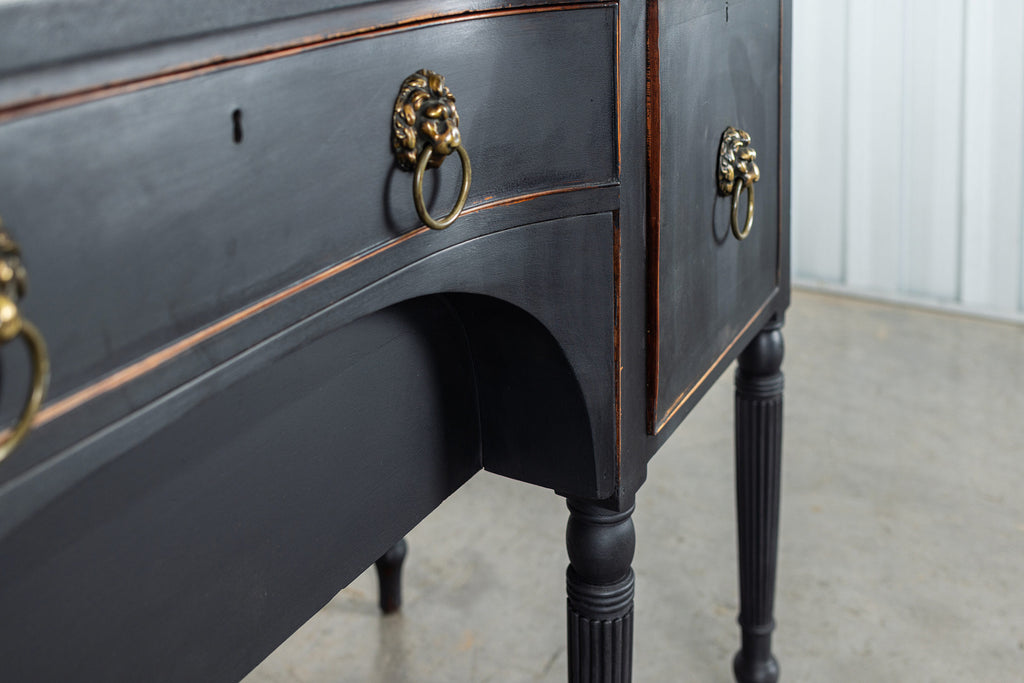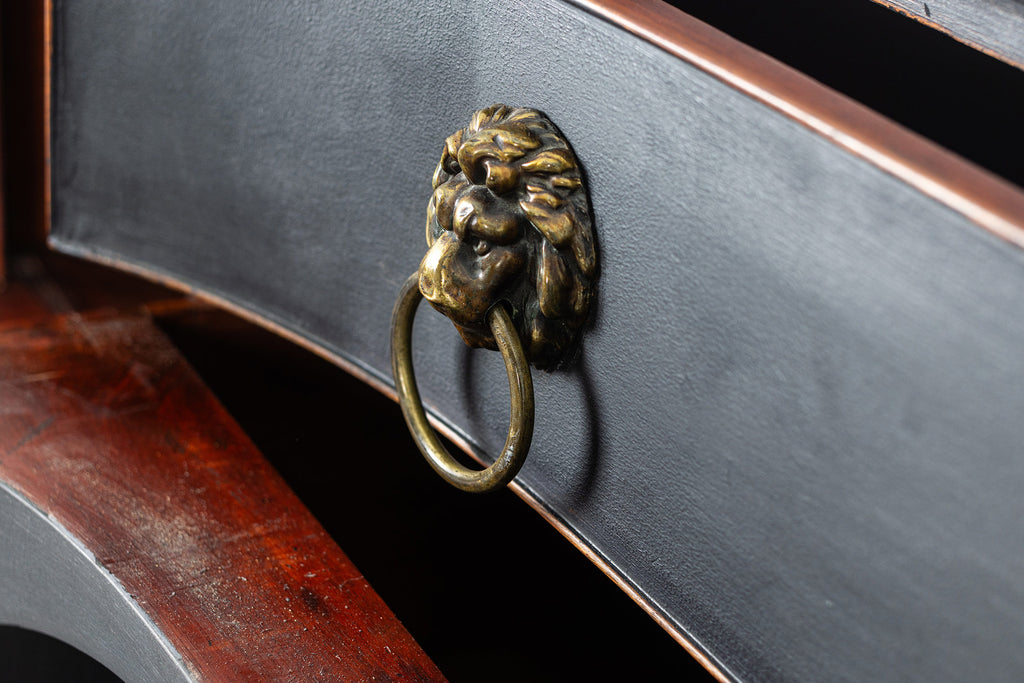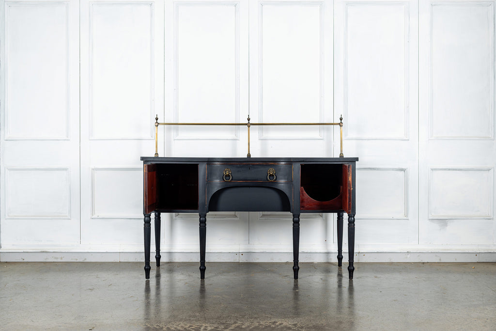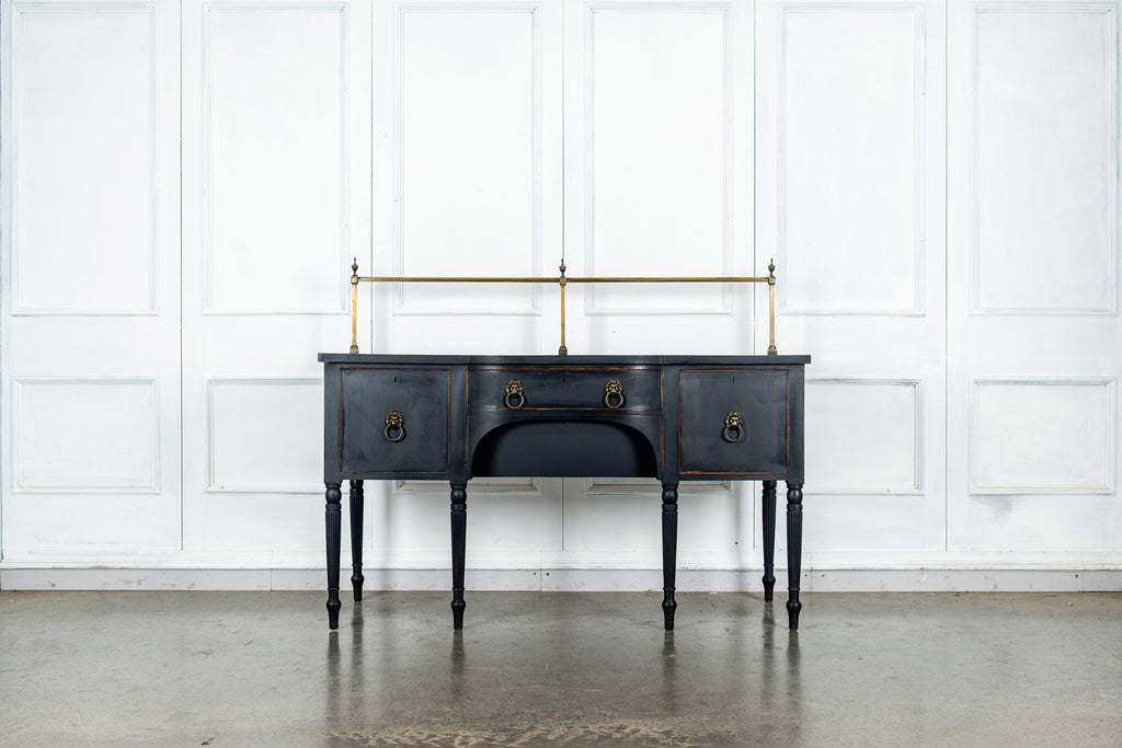 A seriously stylish Georgian mahogany brass galleried breakfront sidevboard later painted with brass gallierd back decorated with polised finials. Two central drawers below are flanked by a cupbaord door on either side with large cast brass lion head handles, and all on turned tapering and reeded legs. Original locks in working order with keys. Elegant and structurally sound.