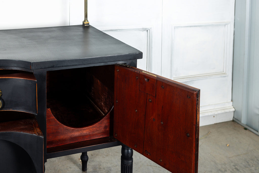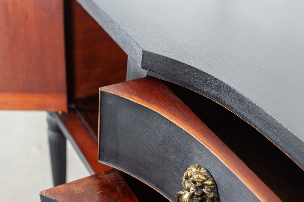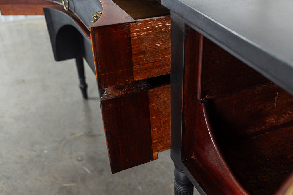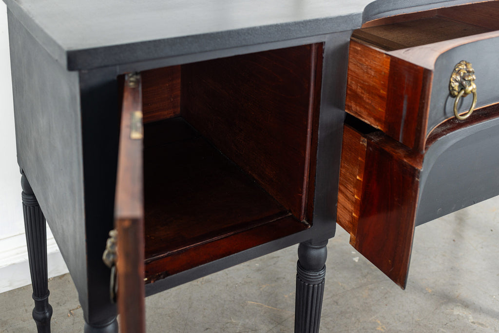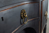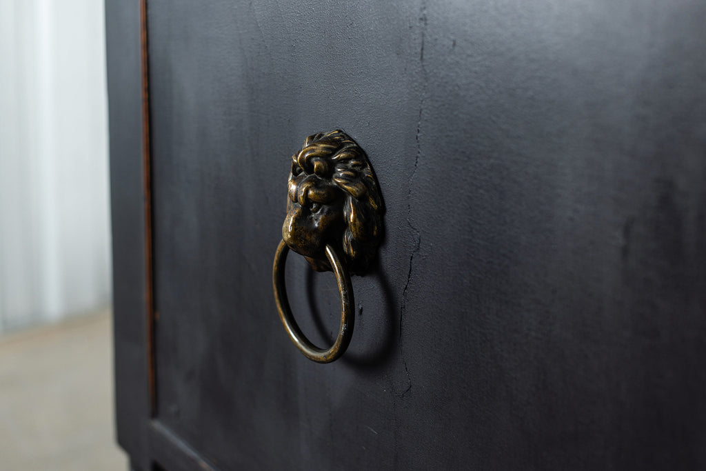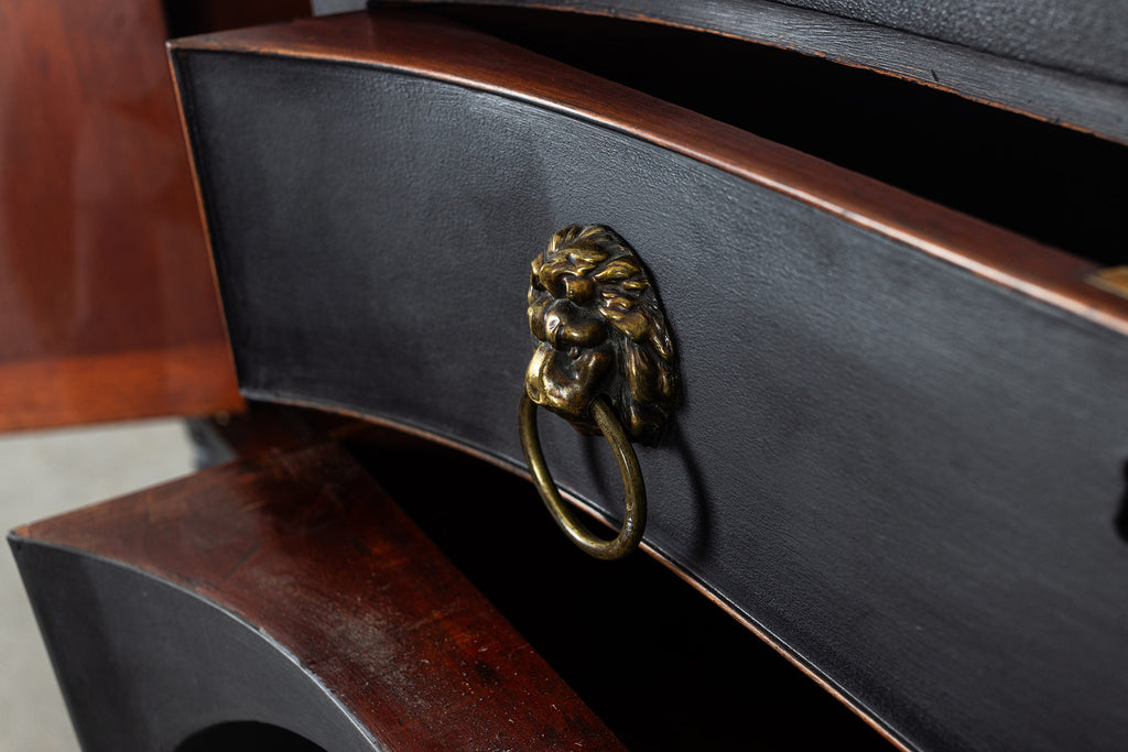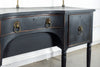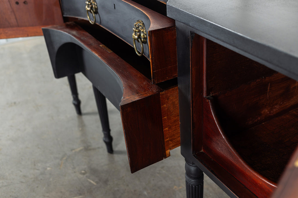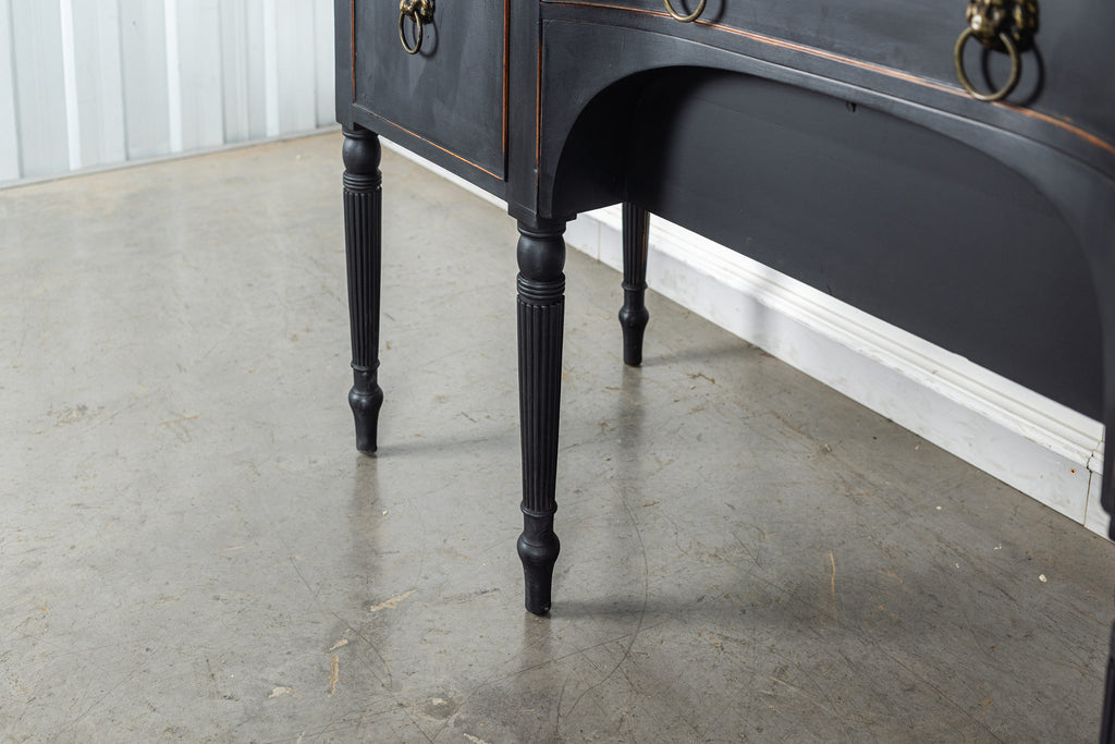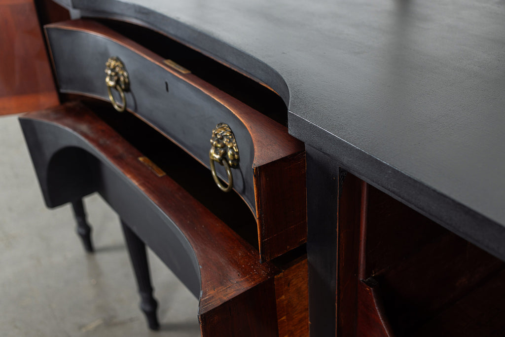 A seriously stylish Georgian mahogany brass galleried breakfront sidevboard later painted with brass gallierd back decorated with polised finials. Two central drawers below are flanked by a cupbaord door on either side with large cast brass lion head handles, and all on turned tapering and reeded legs. Original locks in working order with keys. Elegant and structurally sound.