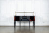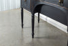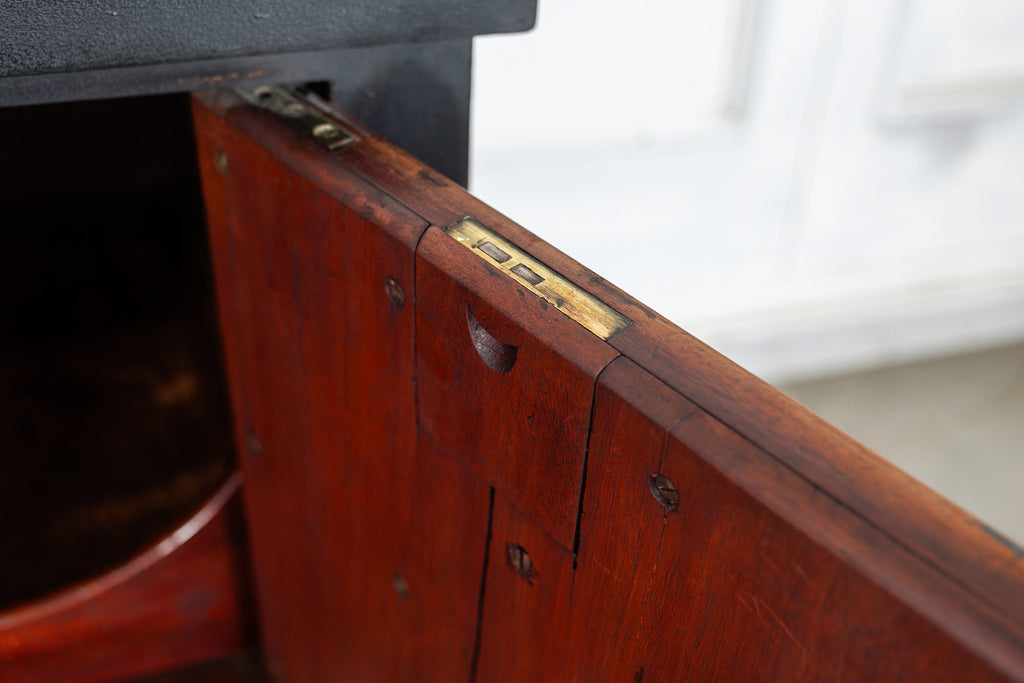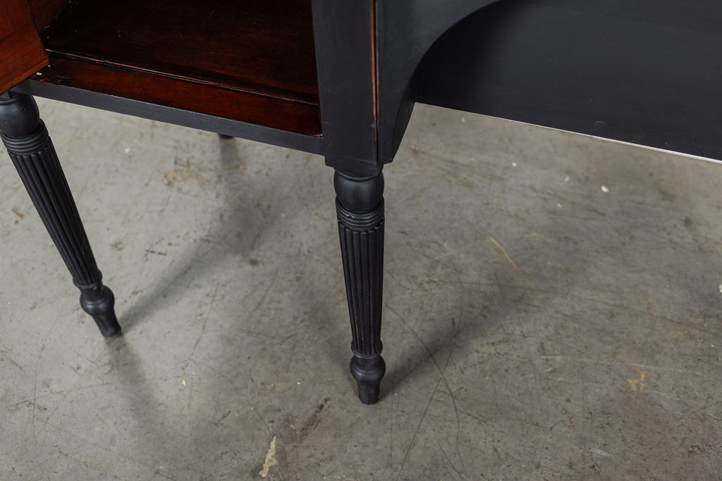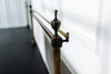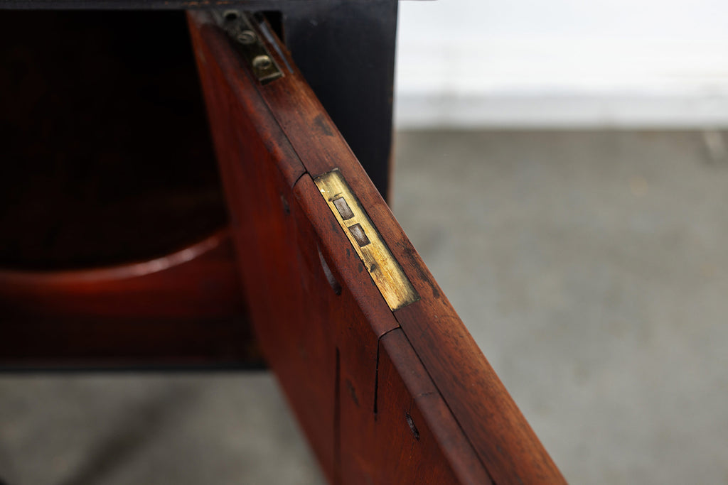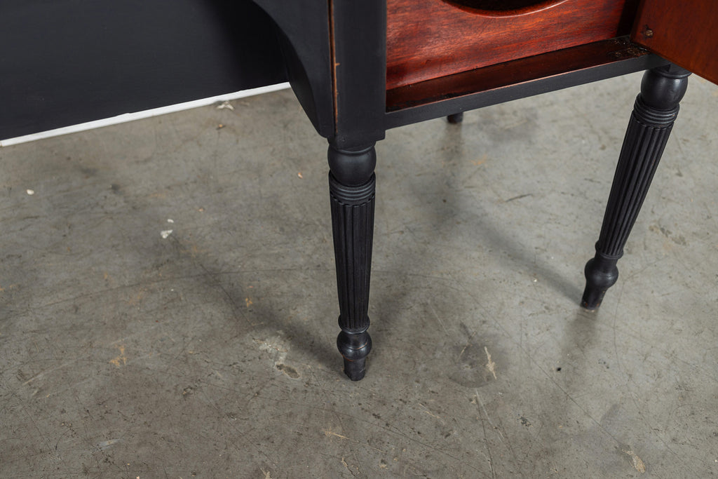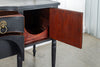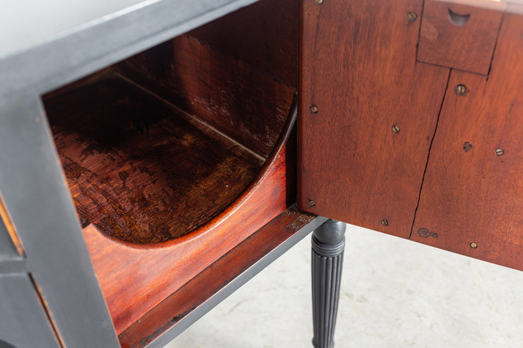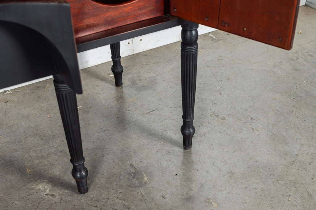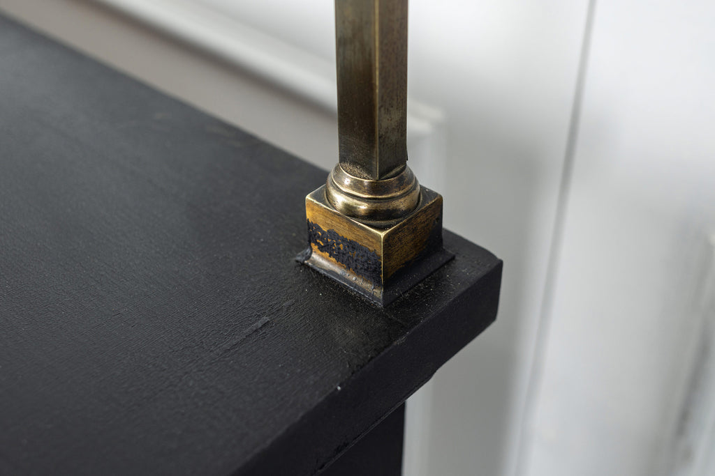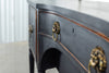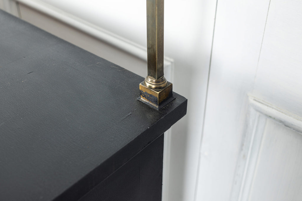 A seriously stylish Georgian mahogany brass galleried breakfront sidevboard later painted with brass gallierd back decorated with polised finials. Two central drawers below are flanked by a cupbaord door on either side with large cast brass lion head handles, and all on turned tapering and reeded legs. Original locks in working order with keys. Elegant and structurally sound.