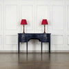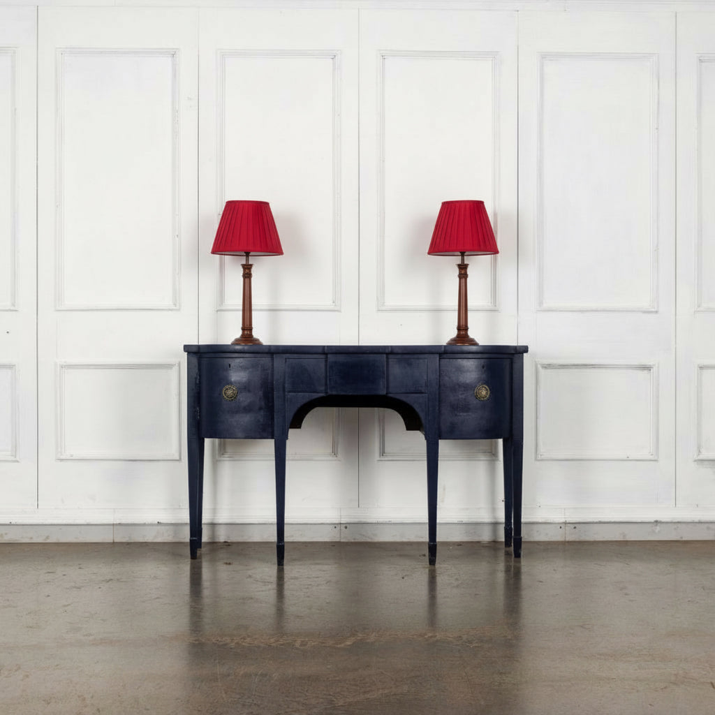 A stylish Georgian sideboard later painted in classic navy. One central frieze drawer is flanked by a cupboard on the left and a drawer on the right on classic tapering legs. Elegant and structurally sound with original locks and original round brass plate handles